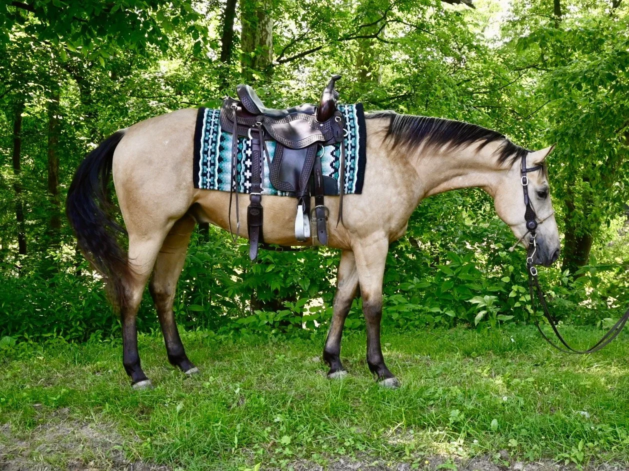 He is curious and willing. Not spooky or reactive. Medium level energy, not sluggish but not hot. A good thinker and enjoys new challenges. Will be a great Ranch Horse or Obstacle Mount. He loves to think and please.